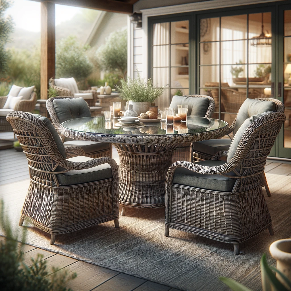 - Round 6-Person All-Weather Wicker Dining Set: A splendid choice from Wayfair, featuring rust-resistant metal and a glass tabletop, perfect for outdoor dining and conversations.