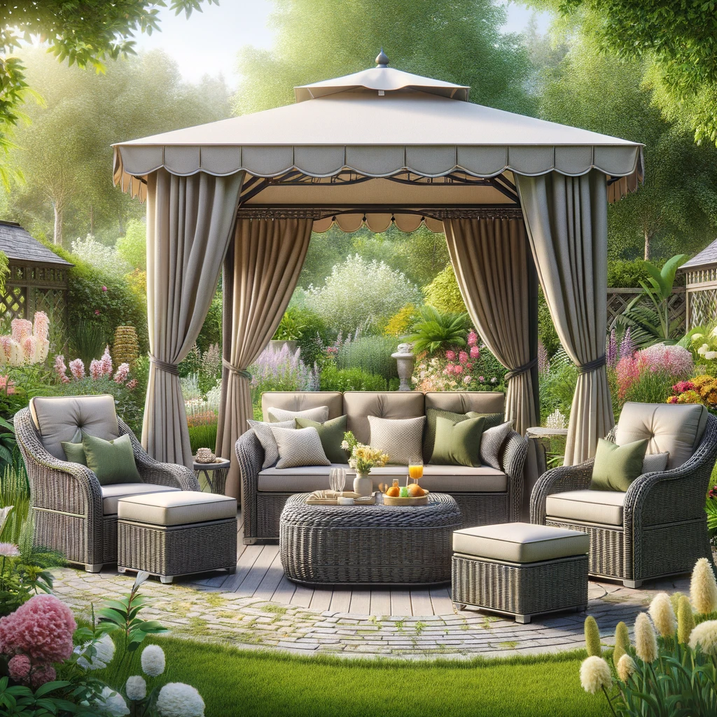- Versatile Composition: A combination of a three-seat sofa with a canopy, two individual chairs, an ottoman, and a side table.